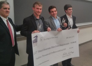 (L–R): Dean of the School of Business William Keep presents the 1st Place prize of $12,000 to M&S Guitars: James Seyffart, Alex Matteson, and Tim Pfenninger. Photo (c) Deric Raymond '11