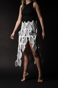 - Artist: Brianna Titus ’23 “I kept gravitating toward making a skirt because I was interested in how the paper would move with my body. I found a book in the free section of the library called Inside the Victorian Home: A Portrait of Domestic Life in Victorian England, which I felt correlated well with the idea of making a feminine piece of clothing. I sewed the folded book pages together with thread.”