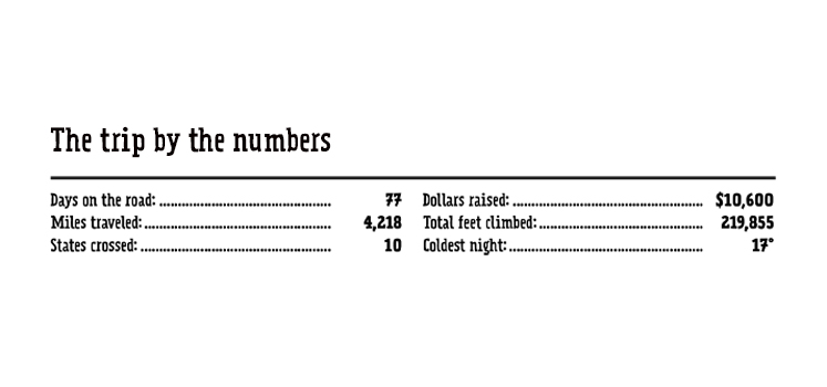 Both were runners for TCNJ’s cross country team, so they assumed they were in shape for such a ride. But the Blue Ridge Mountains in the early days of the trip tested their strength. “We didn’t realize how hard it was until we did it,” says Smith.