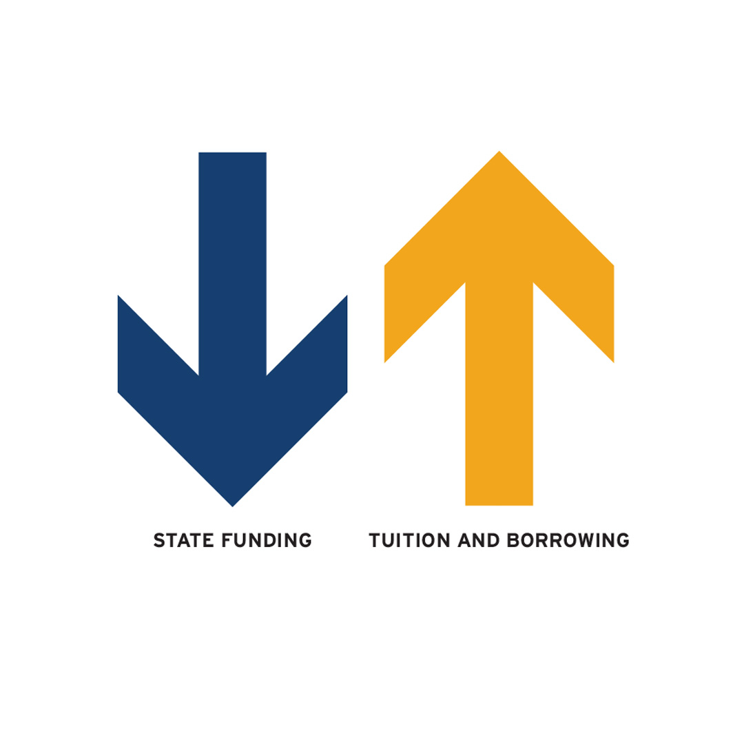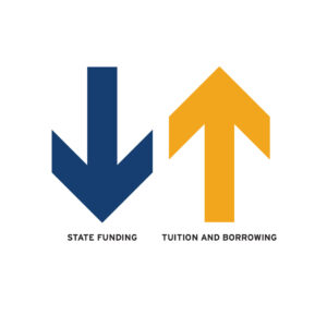 BERNSTEIN: In 1990, the state provided 63% of our funding. Today, that number is about 25%. There’s a close correlation between that decline over the past several decades and the increase in our tuition. We’ve done our best to hold the line on costs, often making difficult choices between, say, investing in scholarships or the wraparound services our students need, like additional counseling, tutoring, and mentoring, or, whether to proceed with or delay meeting critical facility needs, whether they be renovations of labs and classrooms, studios and performance spaces, athletics venues, or residence halls.