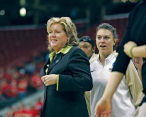 After graduation, Balcomb decided to pursue coaching and “went where the jobs were.” She spent four years on the staff at Niagara University and was also an assistant at Ohio University and Providence College. Her first head coaching position was at Ashland University in 1993, where her team posted an 18-9 record. In 1995, she took over at Xavier University and led the Musketeers to three NCAA tournaments, including an Elite 8 appearance in 2001.