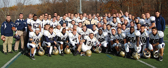 A season that featured as many ups as it did downs for a 5-5 Lions football squad will be remembered for one noteworthy triumph. On October 30 (just after our last issue went to press), Head Coach Eric Hamilton ’75 (center in photo) captured career victory number 200 when the Lions defeated Western Connecticut State University, 22-16. Hamilton became the 12th coach in NCAA Division III history to reach the milestone. As he enters his 35th season at the helm of the Lions football program, he ranks third among active coaches in career victories. Hamilton remarked to The Signal after his 200th win that, “The accomplishment means [I] have been here a while, and the fact that it is my alma mater means everything.”