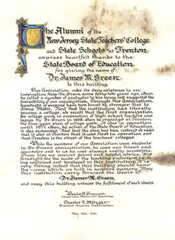 Damage from water, mud, and bugs had taken its toll on many of the items in the capsule, said TCNJ Librarian Pat Beaber, who was there for the opening. However, Beaber was happy to report that one item which might be of most interest to the College community was remarkably well preserved: a beautiful, hand-lettered resolution from the Alumni Association thanking the State Board of Education for naming the building in Dr. James M. Green’s honor. The cream-colored scroll is on vellum, and the first letter is enlarged and decorated with red and blue colors and gold leaf.