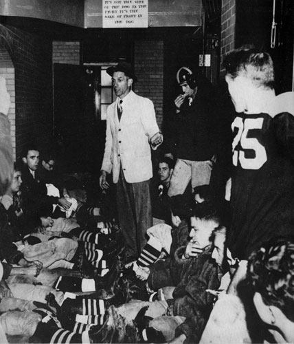Here is, perhaps, the most “famous” football photo in TCNJ history. Taken during a November 1949 game against Montclair State, the picture at left shows then-Head Coach George Ackerman firing his troops up with a halftime pep talk. The Lions trailed 0–6 at that point, but went on to win 7–6, thus securing the team’s first victory in 11 years. News of the win spread far and wide: At the time, State’s 45-game winless streak was the longest such stretch in college sports. Life magazine ran this photo as the “Picture of the Week” in the November 28, 1949, issue. In the accompanying caption, Life’s editors asked whether it was Ackerman’s rallying cry or the sign above his head—it reads, “It’s not the size of the dog in the fight. It’s the size of the fight in the dog.”—that pushed the Lions on to victory. Perhaps you were among the players pictured here and can answer that question? Or maybe you just have a story to tell about that memorable day 62 years ago? We’d love to hear from you. Write us at TCNJ Magazine, PO Box 7718, Ewing, NJ 08628-0718 or magazine@tcnj.edu.