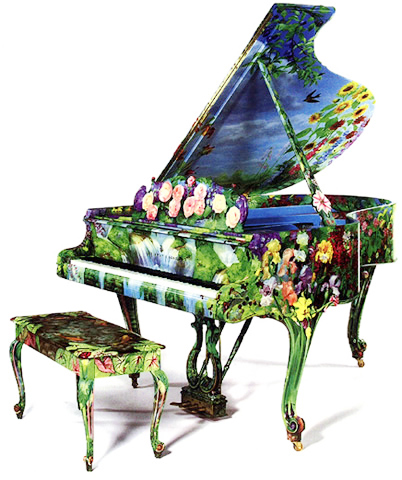 He built upon that new instrument theme in 2000, when Steinway & Sons commissioned him to paint one of their baby grand pianos. Not a picture of the piano, mind you. An actual piano. After working out a few logistics—how to make paint stick to that famously high-shellac surface, how to access the instrument’s underside—Martin created a rich summer scene with bright flowers and vivid green leaves and sunny blue sky. He was actually in the midst of painting that piano on 9/11 and, as a result, added two stalks of holly hocks on the lid to represent the Twin Towers.