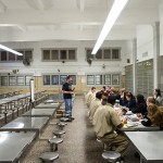 The heavy gate separating us from the prisoner area swings open and we’re led down a concrete hall and into the prison cafeteria. It’s crammed with four-seater stainless-steel tables and it smells sour, like rancid milk mixed with cheap disinfectant. The TCNJ students settle in a long row on one side of the metal tables. Two prison guards in police-blue uniforms watch closely from the back of the room.